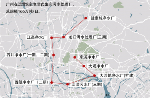 △廣州建成地埋式污水處理廠9座,總產能181萬噸日,呈北斗狀分布于珠江兩岸,被譽為“地下北斗9星”(央廣網發 廣州市水務局供圖)